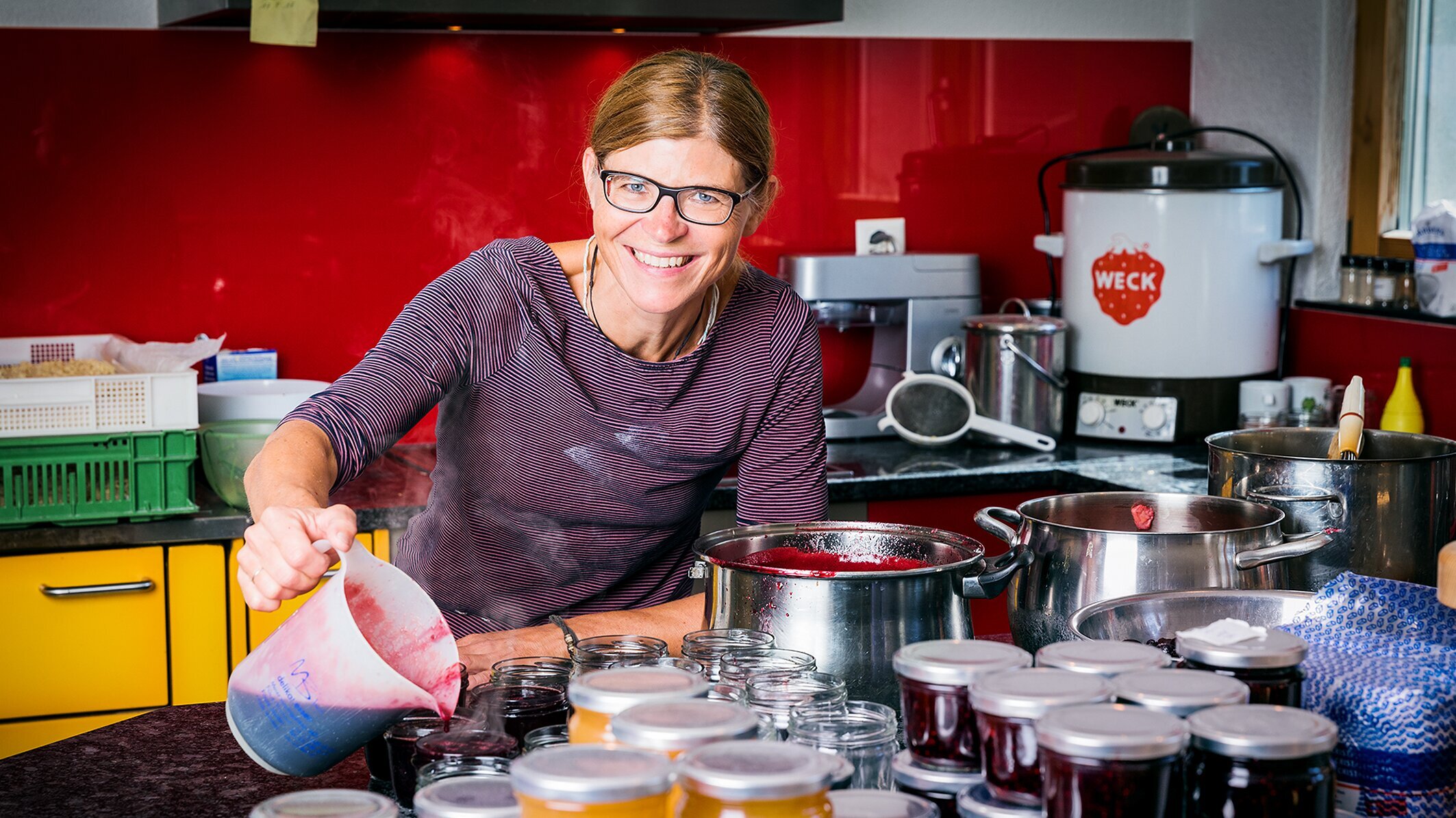 Auf dem Hof Wyden ist Coni, wie sie hier alle nennen, die Chefin. Der Bauernhof gehört ihr seit rund zwanzig Jahren. Sie hält Pferde, Schweine, Schafe und Hühner und erfreut ihre Besucher mit einem Streichelzoo mit Hasen, Ziegen und sogar Schildkröten. Jeden Tag steht sie im Garten, wo sie seltene Gemüsesorten anbaut. Ungewohntes spriesst da: goldener Randen, violette Bohnen oder weisse Tomaten. Das bunte Gemüse verkauft sie jeden Samstag auf dem Markt in Bülach. Sogar am Landfrauensamstag nimmt sie sich die Zeit, mit frischem Gemüse auf den Markt zu fahren. Ganz ohne Unterstützung schafft sie es aber nicht. Ihr Mann Martin hilft nach seinem Arbeitsschluss als Schreiner, die Schafe auf eine neue Weide zu treiben. Auch Conis Götti, Hansjörg Gehring, hilft jeden Tag in Stall und Garten mit und wohnt auch mit der Familie unter einem Dach. So leben bei Hiltebrands, mit den Teenagern Olivia und Dominique, drei Generationen zusammen. Coni schätzt den Zusammenhalt in ihrer Familie sehr, auch wenn sie eigentlich ebenso gerne alleine Zeit verbringt. Richtig frei fühlt sie sich auf dem Rücken eines ihrer Pferde, beim Joggen an der nahegelegenen Tössegg – oder beim Reisen. Kaum haben Coni und ihr Mann genügend gespart, zieht es sie in die Ferne. Auf dem Hof sind die Australienfahne und die mongolische Jurte im Garten ein Zeichen ihrer Weltoffenheit. Conis Landfrauenessen kommt bunt daher: Sie mischt Gemüse aller Couleur zu einem lauwarmen Salat und raffelt eine bunte Rösti. Sie kreiert mit Prosecco, Holundersaft und geschmolzener Schokolade eine Fleischsauce mit überraschendem Geschmack und lässt die Frauen rätseln, welches Fleisch sie wohl für ihr Geschnetzeltes verwendet hat. Sie wagt es, den Frauen Ungewohntes aufzutischen und kann nur hoffen, dass es ihnen schmeckt.