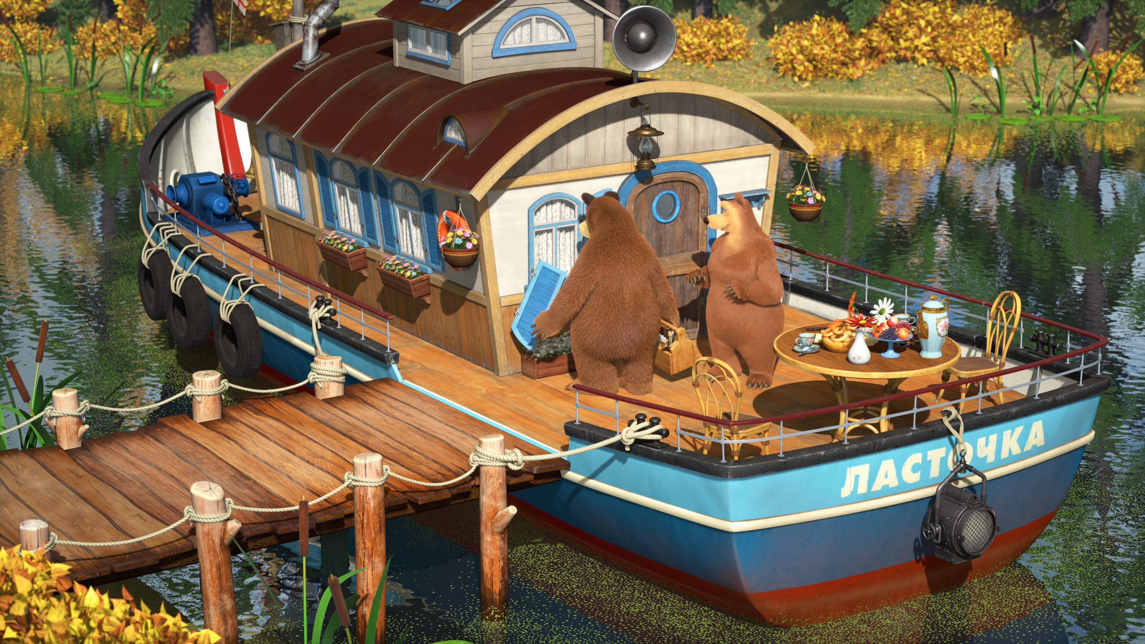 Wer ist der Boss?: Der Bär repariert die Fensterläden seiner Liebsten, aber wer trägt solange die Verantwortung für Mascha, den Panda und den Pinguin? Zuerst darf der Panda auf die anderen aufpassen, aber es entsteht ein Tohuwabohu. Als Mascha an der Reihe ist, geraten die Bienen des Bären in Aufruhr. Zum Schluss übernimmt der Pinguin die Verantwortung. Triumphierend fliegen die drei mit Pinguins Flugzeug hinweg über die Köpfe vom Bären und seiner Freundin. Lügen haben kurze Beine: Mascha, Bär und Panda wollen die malerischsten Plätze im Wald besuchen. Mascha und Panda sind nur damit beschäftigt sind, sich gegenseitig zu übertrumpfen – bis es dem Bären reicht und die drei ihre Rückreise antreten. Mascha sieht ein, das Lügen unheimlich anstrengend ist – es genügt eigentlich auch, seine Phantasie spielen zu lassen.